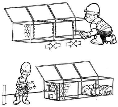 注意:因?yàn)榇虬谋容^緊密,所以剪斷捆扎絲的時(shí)候,大包會(huì)一下子散開(kāi)。 石籠網(wǎng)箱內(nèi)填充的石料應(yīng)堅(jiān)硬、耐用、不易碎,石頭的粒徑應(yīng)控制在10~20cm之間,可以有5%的變化,但最小粒徑不得小于網(wǎng)孔尺寸。