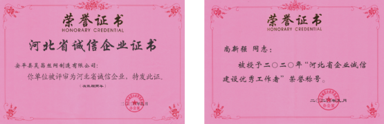 近期,由河北省誠信企業(yè)評選委員會辦公室聯(lián)合河北省企業(yè)家協(xié)會組織召開的“河北省誠信企建設(shè)經(jīng)驗交流會”在石家莊市隆重舉行。會上,安平縣昊昌絲網(wǎng)制造有限公司被大會評選為“2020年河北省誠信企業(yè)”,公司總經(jīng)理尚新強榮獲“河北省誠信建設(shè)優(yōu)秀工作者”榮譽稱號,這標志著公司在積極創(chuàng)建誠信守法企業(yè),積極履行企業(yè)社會責(zé)任方面得到國家相關(guān)部門的肯定與認可。