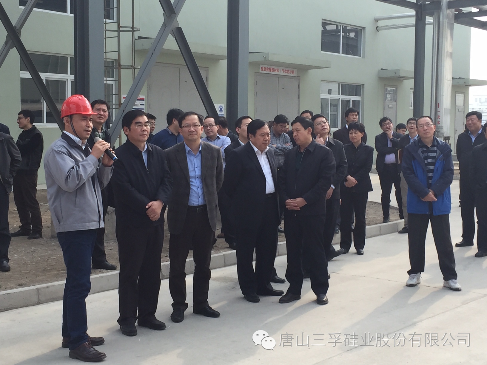 在高純四氯化硅車間現(xiàn)場,孫總向觀摩團...