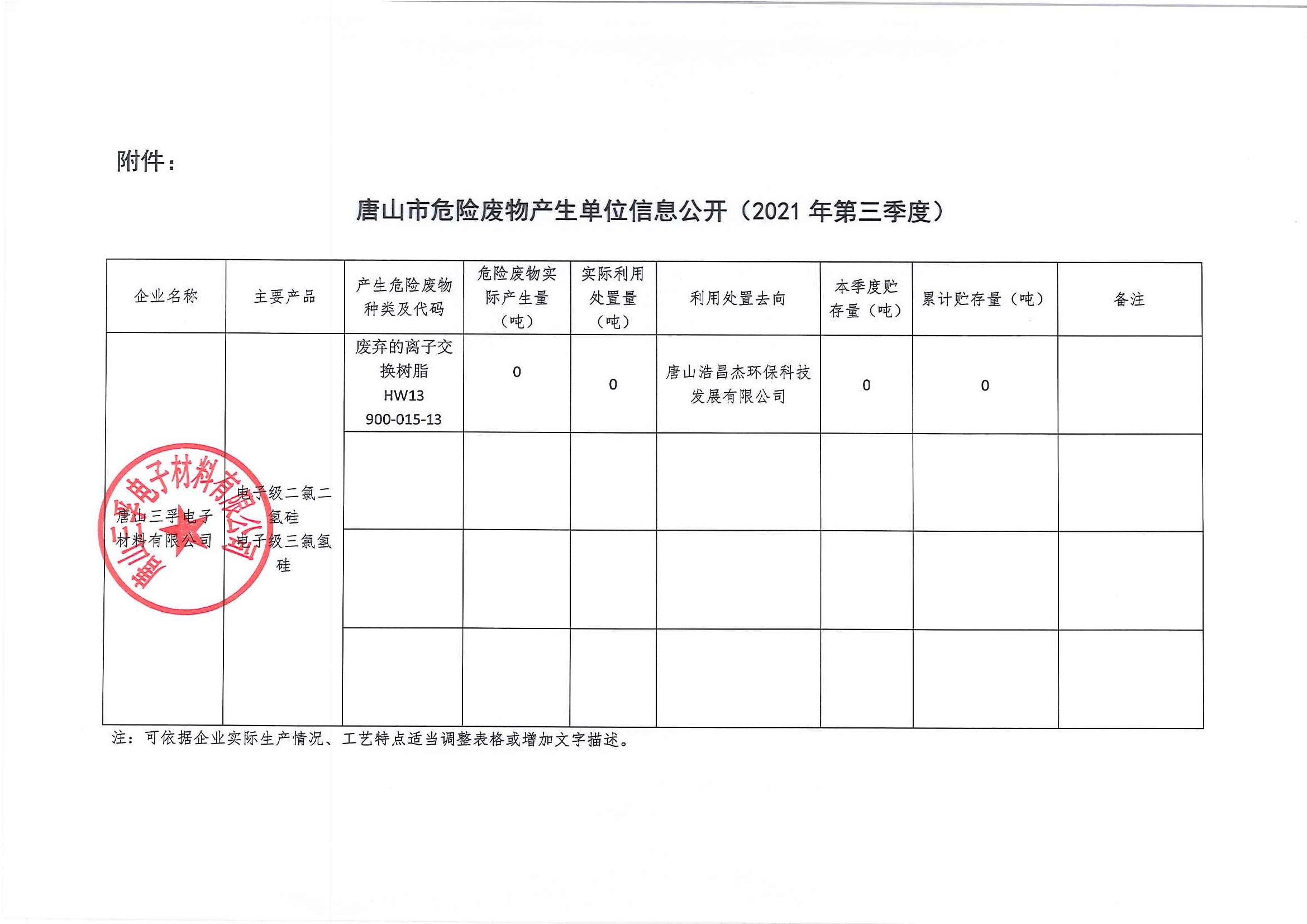 唐山三孚電子材料有限公司 危險(xiǎn)廢物 三季度信息公開(kāi)