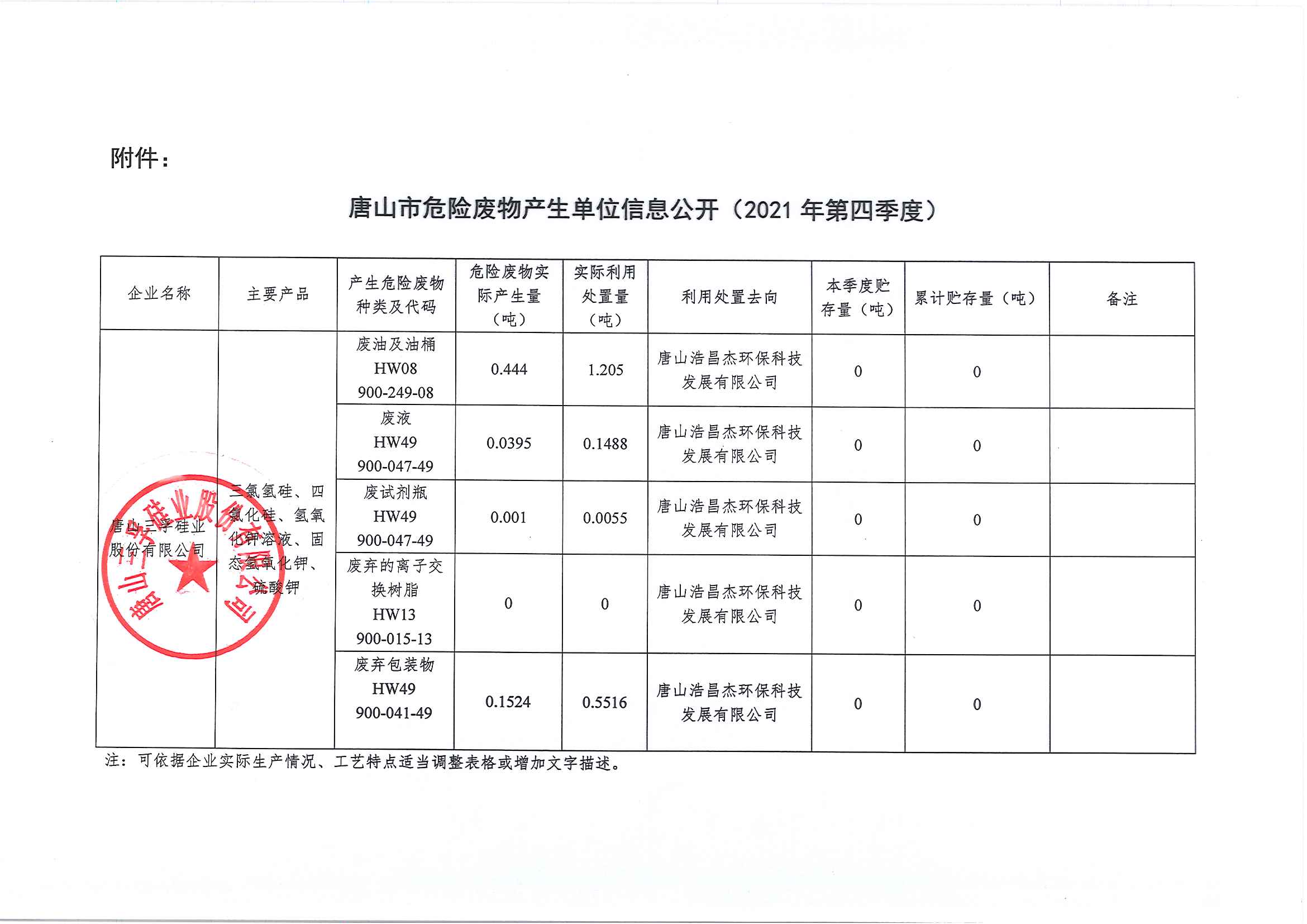 唐山三孚硅業(yè)股份有限公司2021年四季度危險廢物信息公開