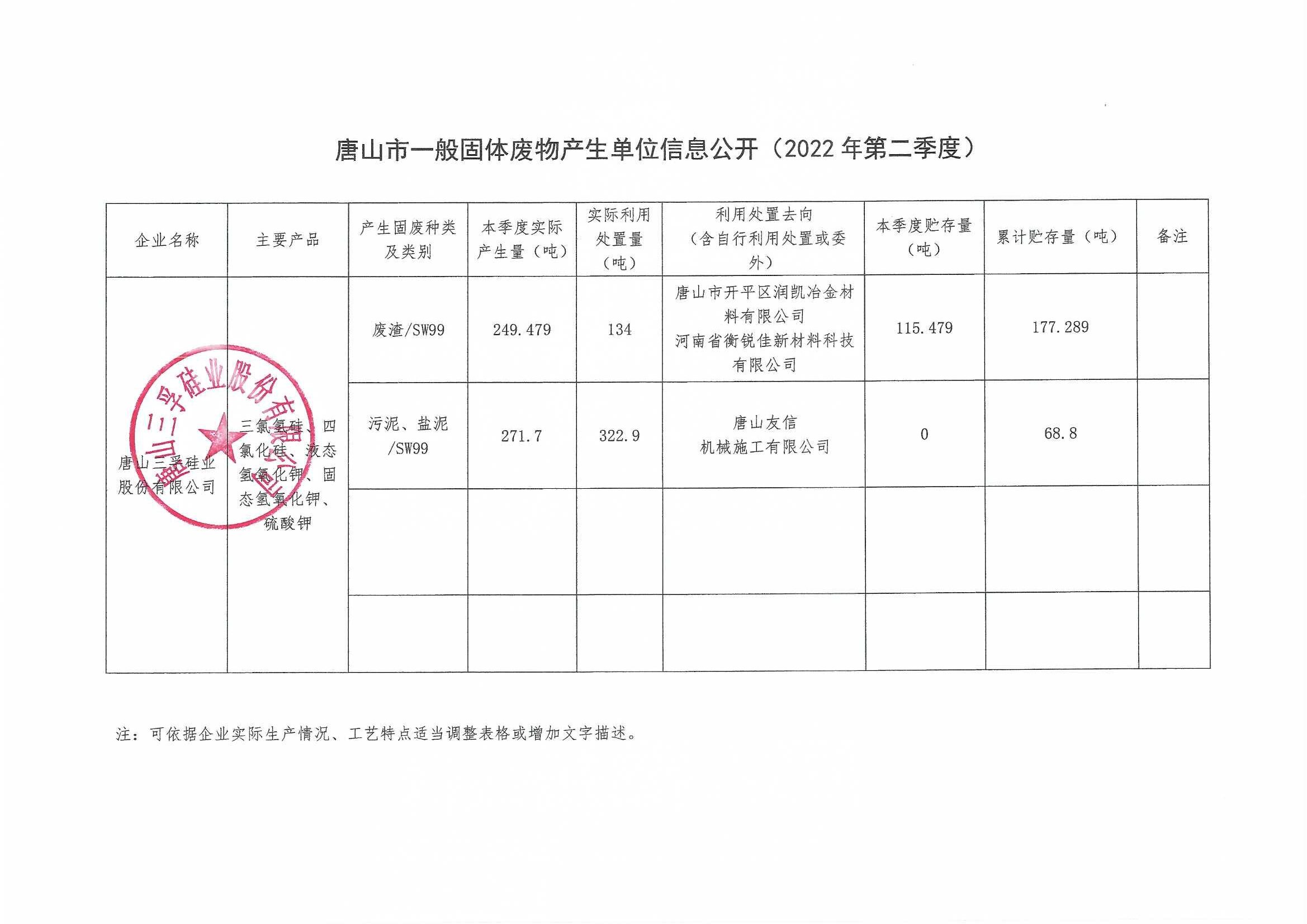 唐山三孚硅業(yè)股份有限公司2022年二季度一般固體廢物廢物信息公開
