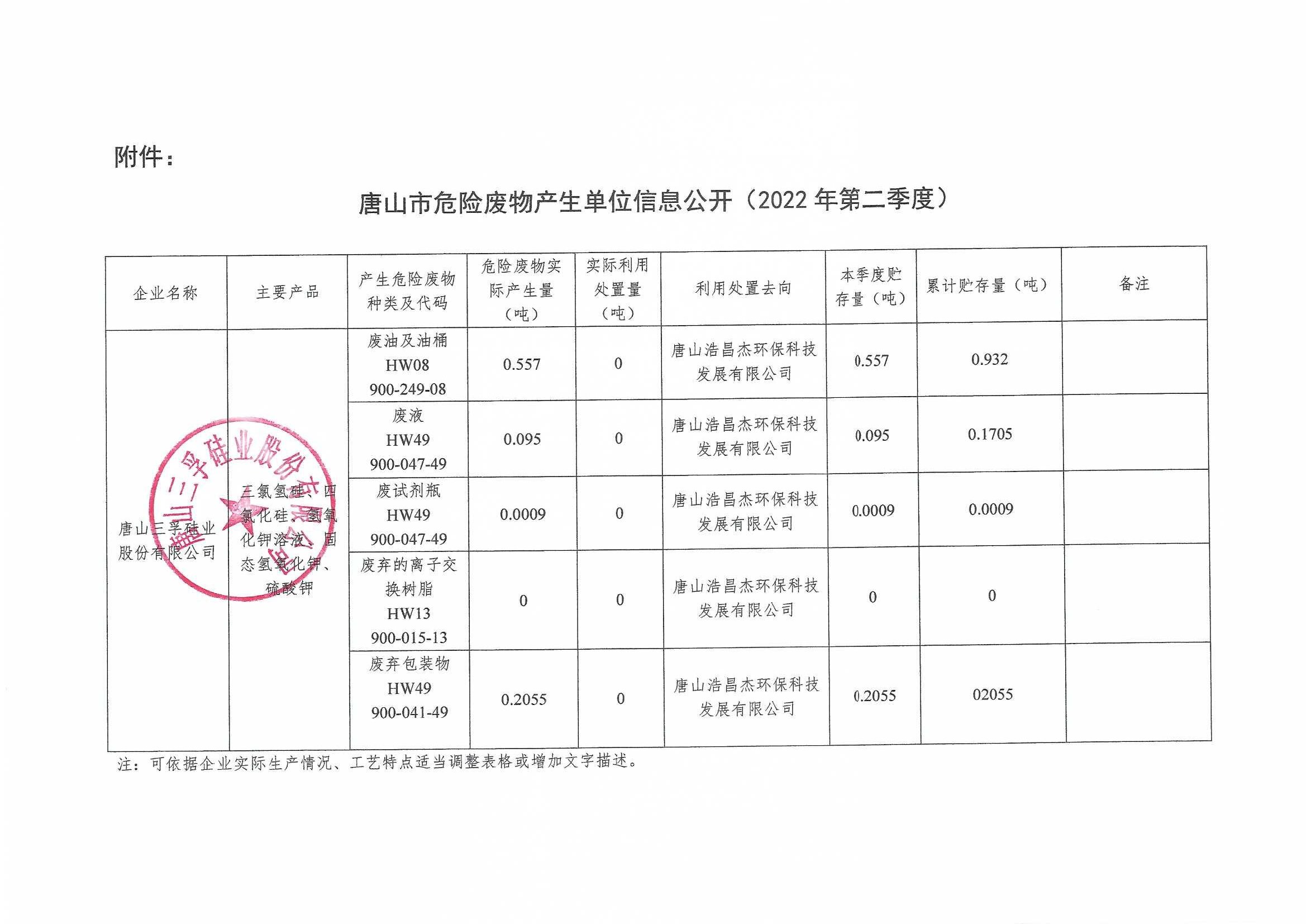 唐山三孚硅業(yè)股份有限公司2022年二季度危險廢物信息公開