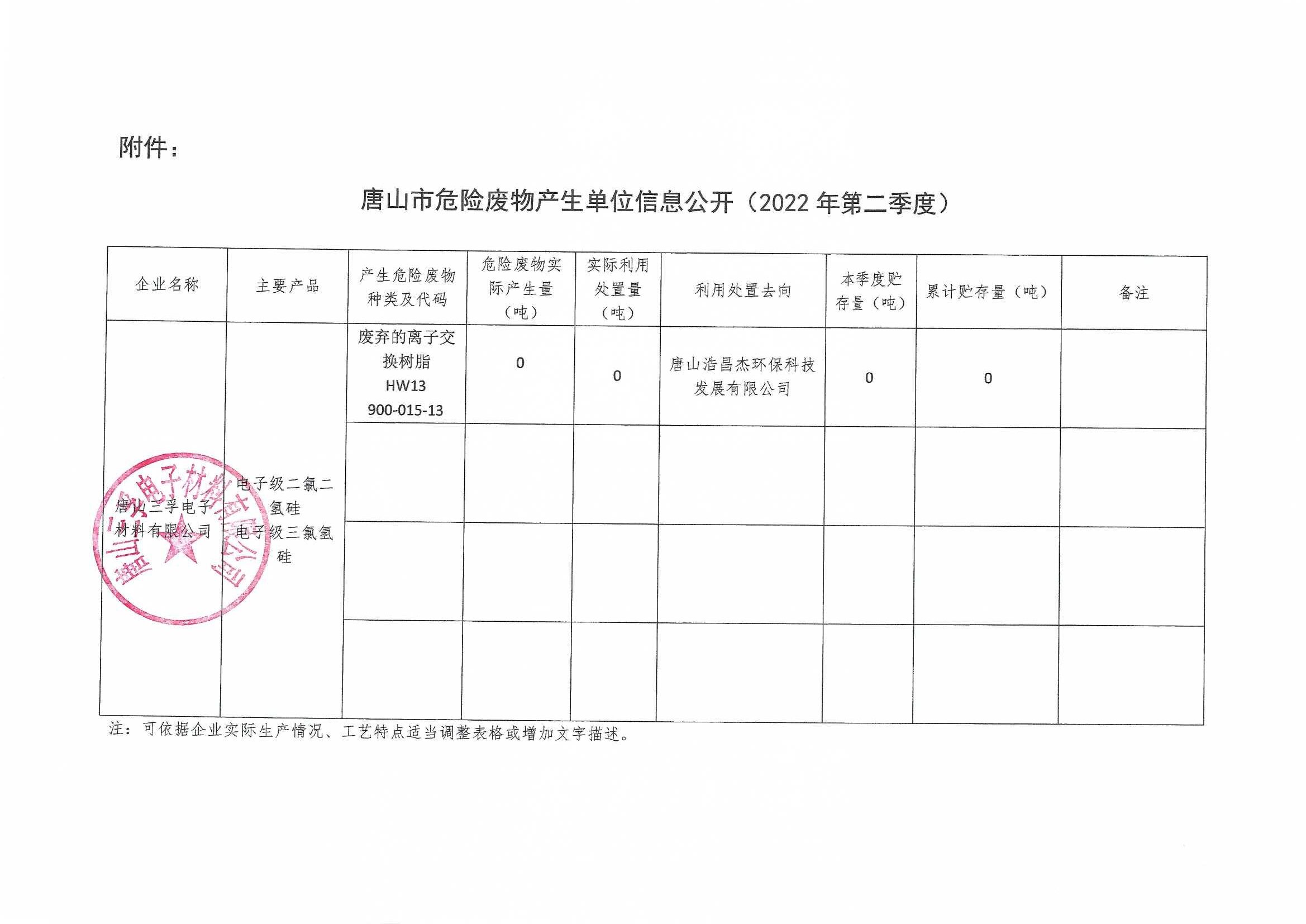 唐山三孚電子材料有限公司2022年二季度一般固體廢物廢物信息公開