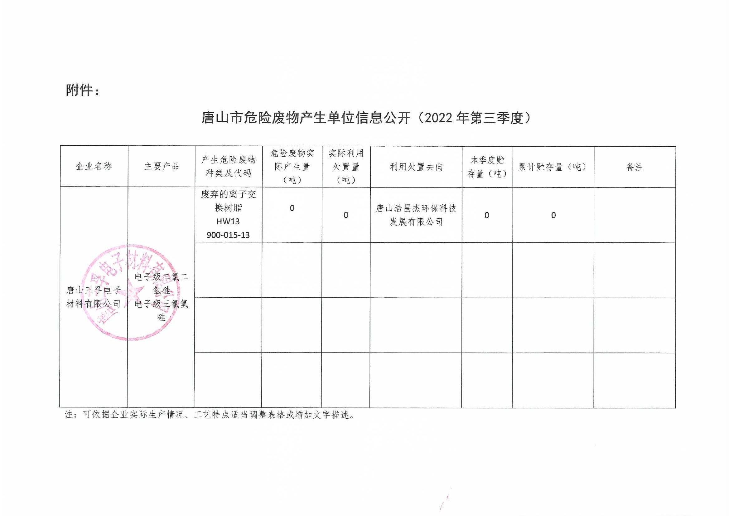 唐山三孚電子材料有限公司2022年第三季度一般固體廢物信息公開