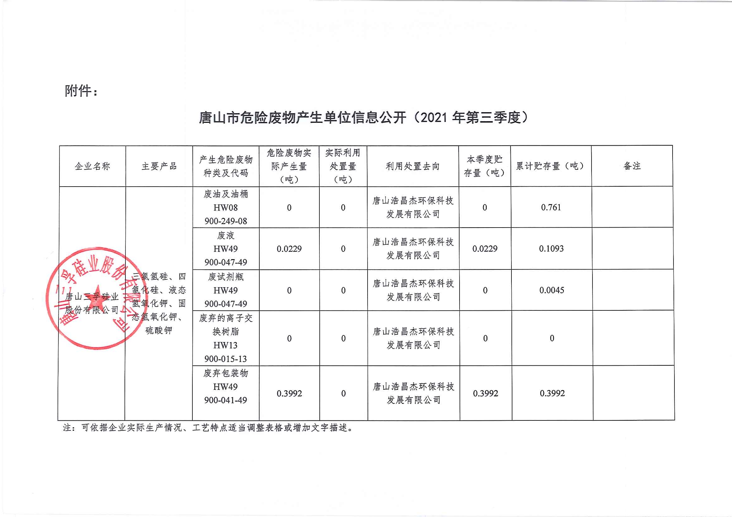 唐山三孚硅業股份有限公司 危險廢物 三季度信息公開